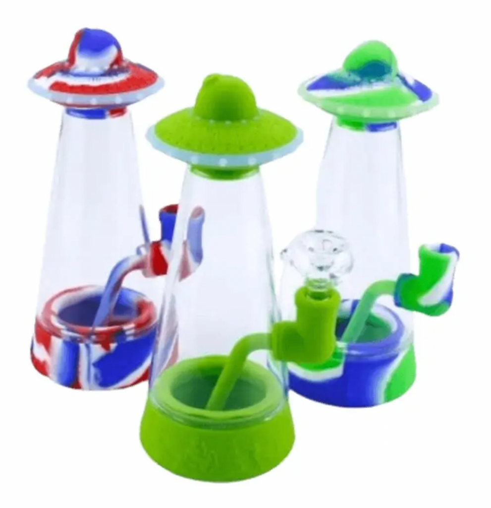 Creativa Bongaa hechas con vidrio y silicona con bowl de vidrio removible para facilitar la limpieza, con un diseño original con una nave platillo volador.