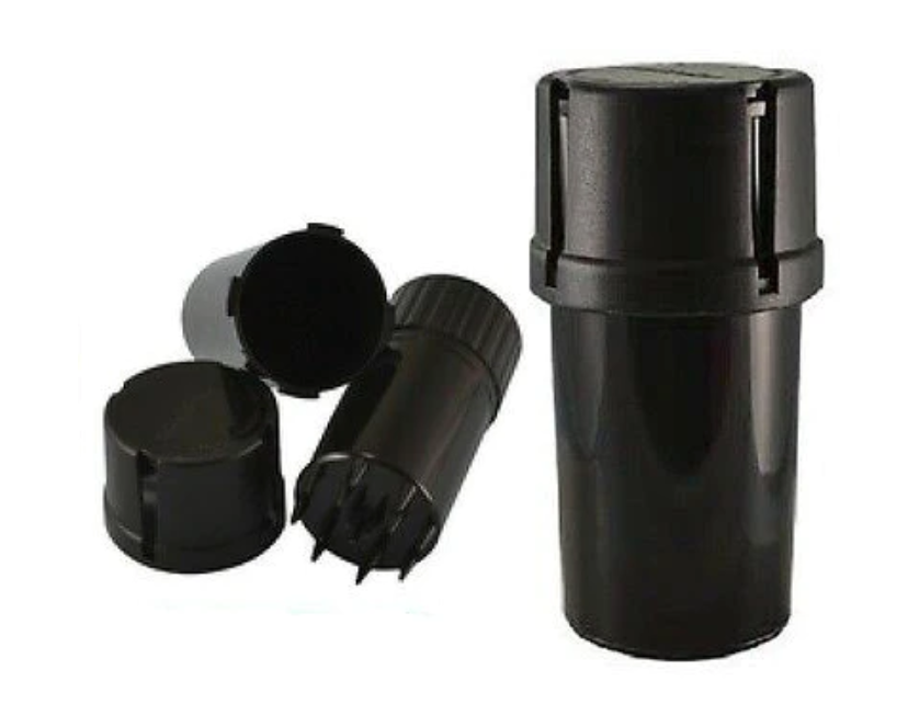 Grinder (moledor) echo de plástico con divisiones para poder guardar tus hierbas molidas y polvo (polen) concentrado en la división inferior.