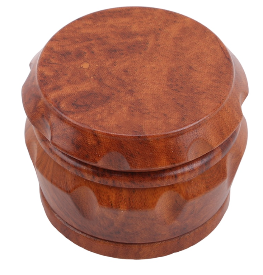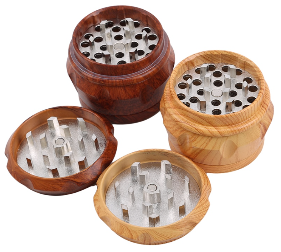 Grinder (moledor) echo de aluminio con efecto de madera, con 3 divisiones. Este grandioso grinder puede desarmarse y separar sus piezas completamente para limpiarlo mas rápido y fácilmente.