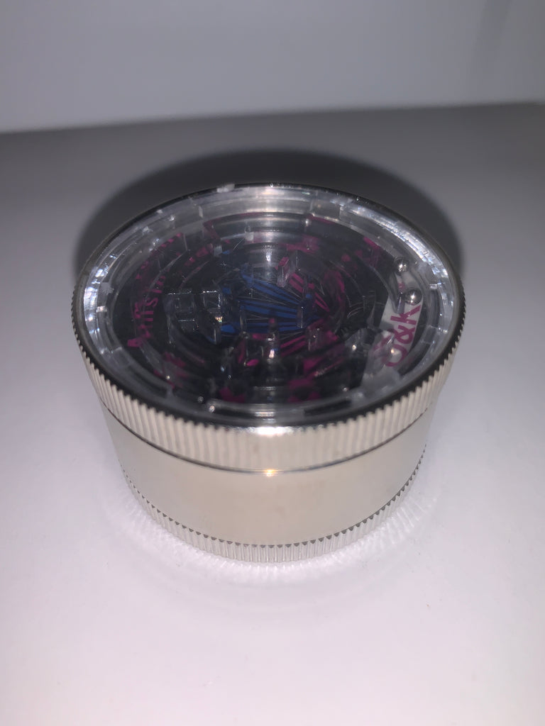 Grinder de aluminio de excelente calidad con 2 divisiones para guardar hierbas molidas y polvo (polen) en el compartimiento inferior. Con un juego de laberinto en la tapa superior!