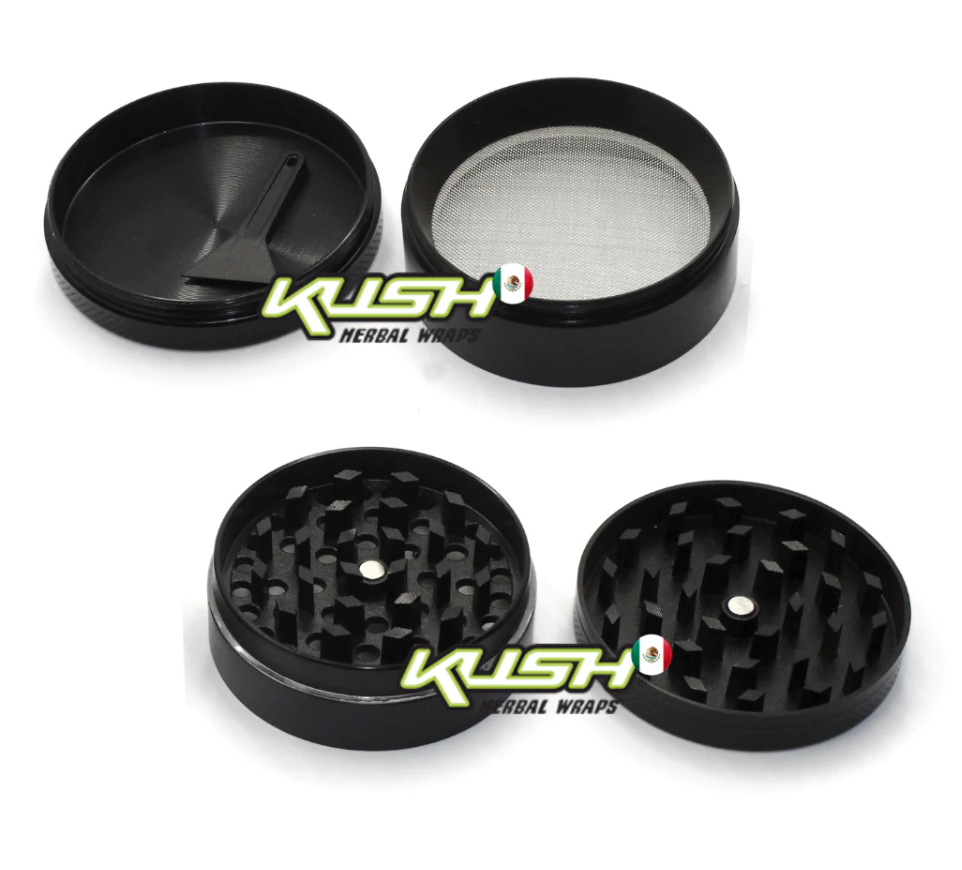 Molino (Grinder) Kush Tiene un diámetro de 50mm y una altura de 38mm, 4 piezas y 3 compartimentos.