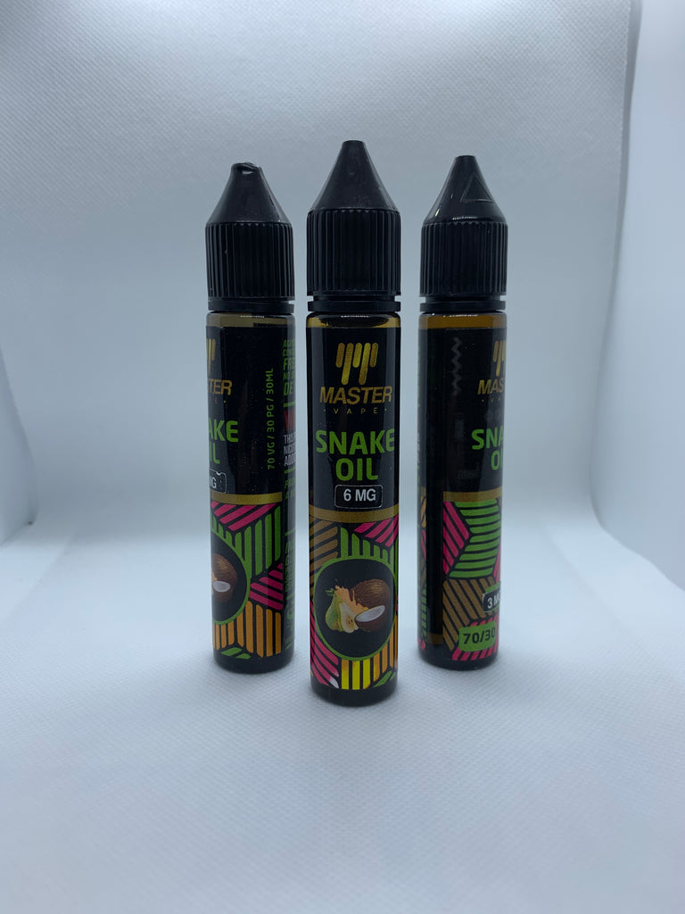 Liquido para vaporizador marca Master Vape sabor Snake Oil (Pera con coco y babaría). Contiene 30 ml. con 3 mg de nicotina.
